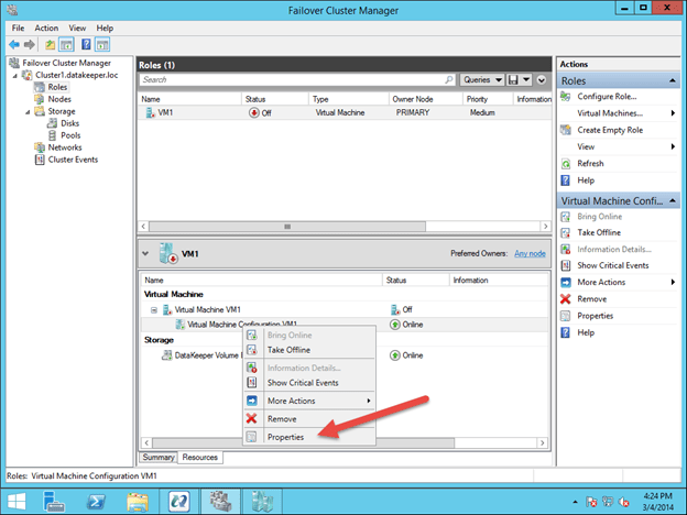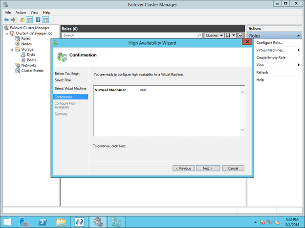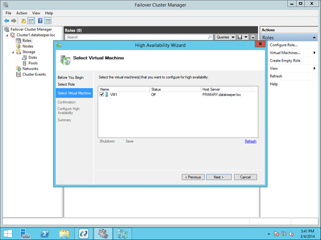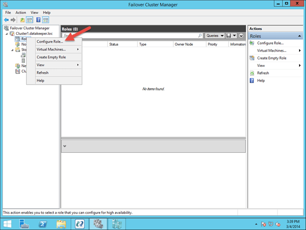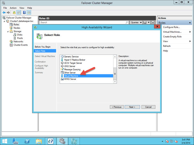To begin the clustering process, open up Failover Cluster Manager. Right click on Configure Roles and choose Virtual Machine as the role you want to create.