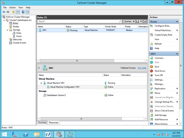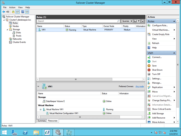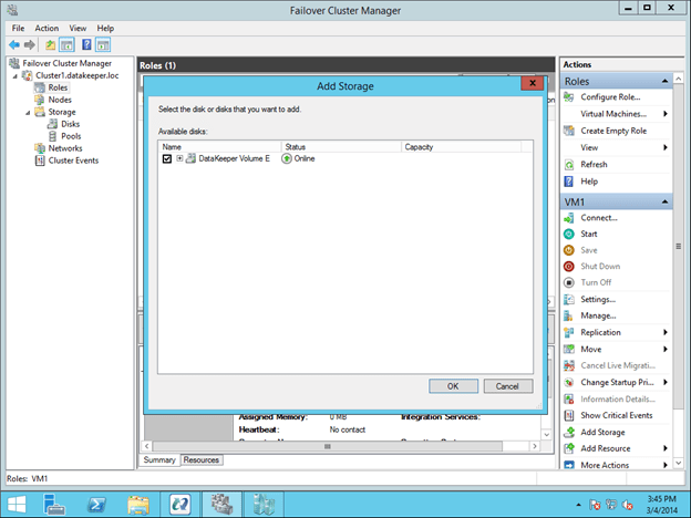 To make the DataKeeper Volume E part of the VM Cluster Resource Group, right click on the role and choose Add Storage. Add the DataKeeper Volume that you will see listed in Available Disks.
