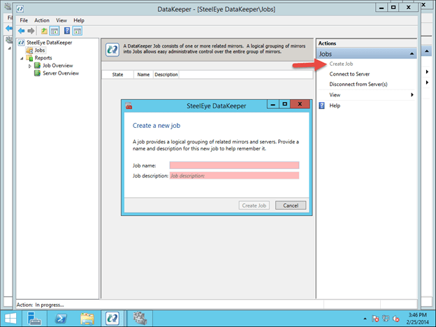 Once you are connected, click on Create Job to create a mirror of the volume that contains the virtual machine you want to make highly available as shown below. In this example we will mirror the E drive.