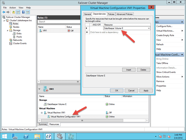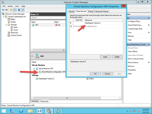 After the DataKeeper Volume is added to the VM Cluster Resource Group, you will need to add the DataKeeper Volume as a dependency of the Virtual Machine Configuration resource.