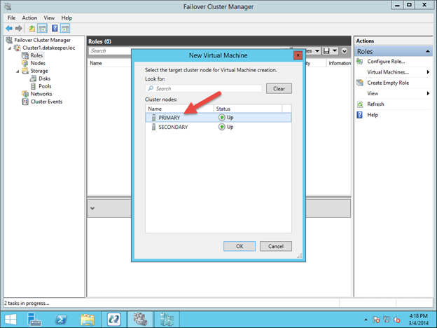 To get started, open the Failover Cluster Manager and right click on Roles and choose Virtual Machine – New Virtual Machine.