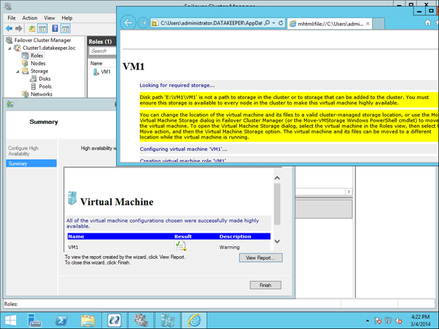 You will see that the VM resource will be created, but there will be some warnings. The warnings indicate that the E drive is not currently part of the VM Cluster Resource Group.