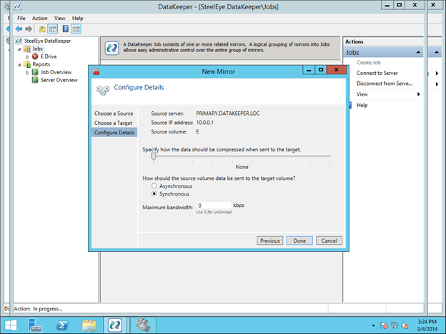 The final screen shows the options available for mirroring. For local area networks, Synchronous mirroring is preferred. When replicating across wide area networks, you will want to use Asynchronous replication and possibly enable compression. I would not limit the Maximum bandwidth as that could potentially cause your mirror to go out of sync if your rate of change (Disk Right Bytes/sec) exceeds the Maximum bandwidth specified. However, you may want to temporarily enable Maximum bandwidth during the initial mirror creation process, otherwise DataKeeper may flood the network with the initial replication traffic as it tries to get in sync as quickly as possible. Both Maximum bandwidth and Compression settings can be adjusted after the mirror is created. However, you cannot change between Synchronous and Asynchronous mirroring once the mirror has been created without deleting the mirror and recreating it.
