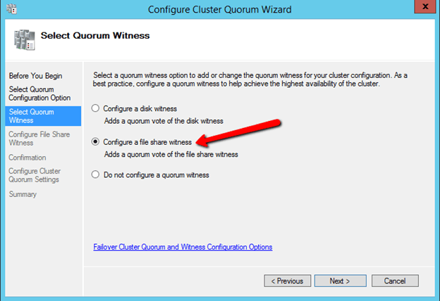 We now need to add a File Share Witness to our cluster to ensure the quorum requirements for two node cluster are satisfied. The file share witness will be configured on the DC2 server, the domain controller that is also running in the Azure Cloud.