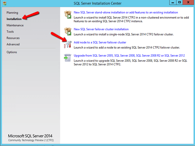 When the installation completes on SQL1, it is time to run the SQL installer on SQL2 and add the second node to the cluster. Run the Setup on SQL2 and choose Add node to a SQL Server failover cluster.