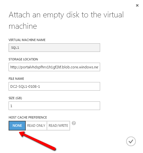 There are lots of things to consider when considering storage options for SQL Server. The safest and easiest method is the one we will use in this post. We will use a single volume for our data and log files and have caching disabled. You will want to read this article for the latest information on SQL Server Performance Considerations and best practices for Azure.